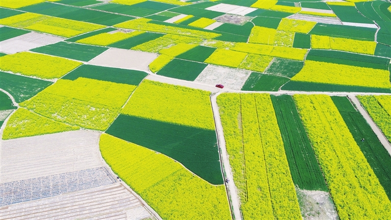 4月25日在位于黄土高原的甘肃省天水市武山县拍摄的油菜花田(无人机照片)。