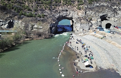 4月27日,位于古交市河口镇汉道岩村的露营地游人众多,汾河从隧道穿过、风景秀丽、空气宜人。牛利敏 摄