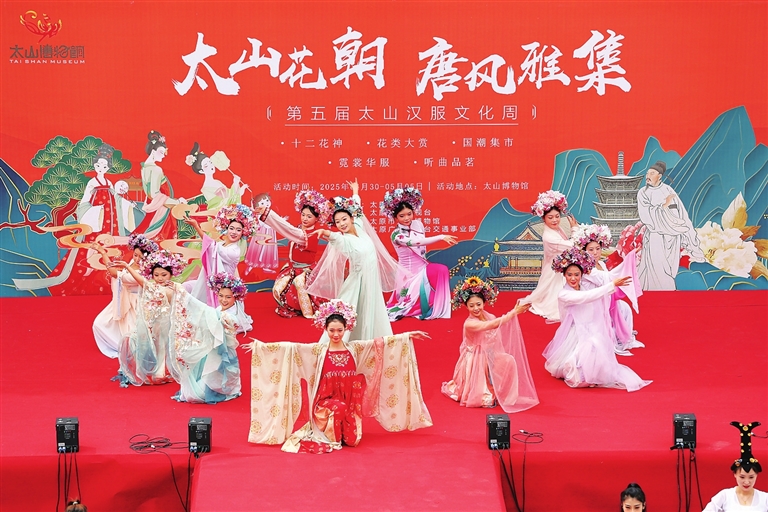“五一”假期,太山博物馆将开展以“太山花朝·唐风雅集”为主题的汉服文化周活动。该活动以十二花神为线索,结合唐代文人雅集文化,为游客开启一场诗画交融的时空奇旅。图为4月30日,舞蹈节目《盛世花朝》拉开活动序幕。王韵菲 邢海莺 摄影报道