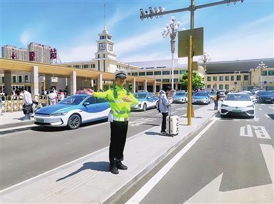 5月1日,太原火车站周边迎来客流和车流高峰。为确保节日期间交通安全、畅通,太原铁路公安处交管支队精心部署,民警坚守岗位,疏导拥堵路段,为旅客出行保驾护航。王韵菲 张 杰 摄影报道
