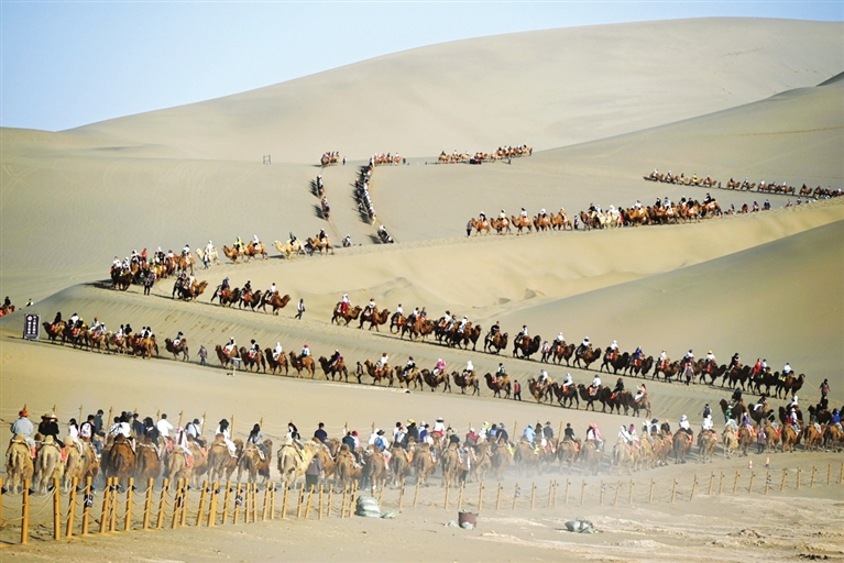 5月1日,游客在甘肃省敦煌市鸣沙山月牙泉景区游览。“五一”假期里,人们走出家门,尽享假日时光。新华社发 (张晓亮 摄)