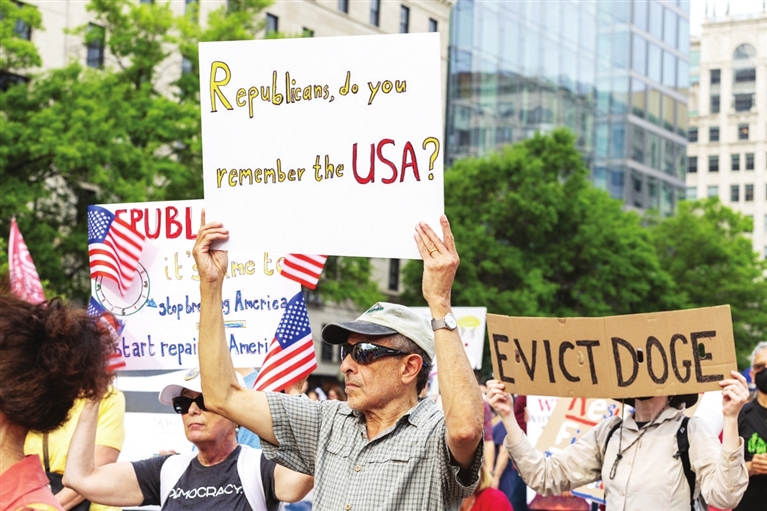 5月1日,示威者在美国华盛顿手举标语参加集会。当日,美国芝加哥、洛杉矶、华盛顿等多地举行“五一”国际劳动节大规模集会示威活动。新华社记者 胡友松 摄