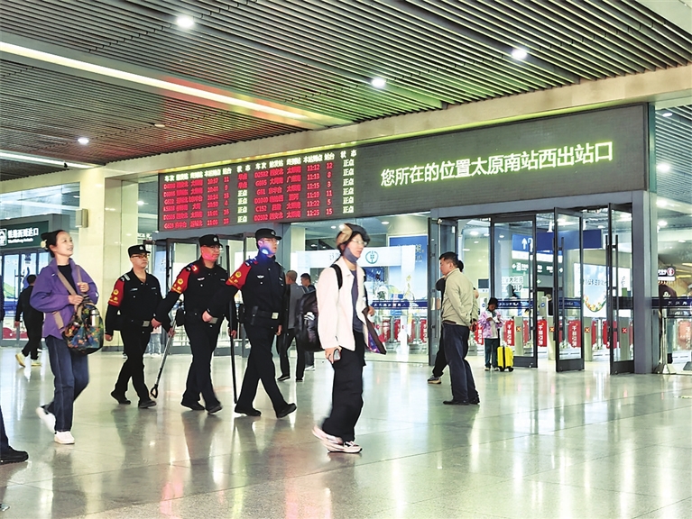 “五一”期间,太原铁路公安处太原南站派出所采用警力前置、显性用警、巡逻巡控等方式强化治安管控,确保旅客平安出行。图为5月4日,南站派出所民警在出站口值勤。王韵菲 董 杰 摄影报道