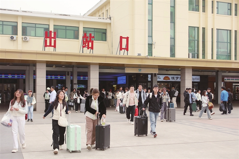 5月5日,“五一”假期迎来返程客流高峰。图为太原站出站口返程客流鱼贯而出。张澍宏 摄