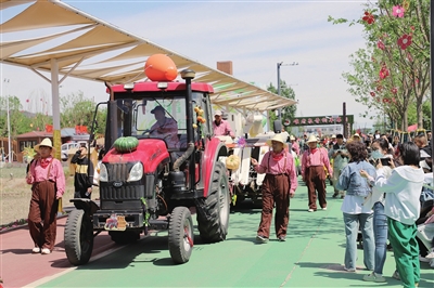 “五一”假期,稻田公园推出丰富多样、趣味十足的系列活动。图为5月3日,园区开展农耕机械总动员巡游活动,工作人员驾驶不同的农耕机械与游客近距离互动。张昊宇 摄