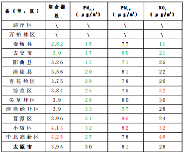 1.综合指数、PM10和NO2指标排名前两位的标为绿色,排名后两位的标为红色;