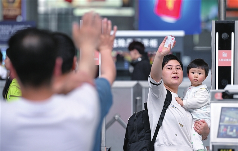 5月5日,在重庆火车北站,旅客与亲友挥手告别。当日是“五一”假期最后一天,各地迎来返程高峰。新华社记者 陈 诚 摄