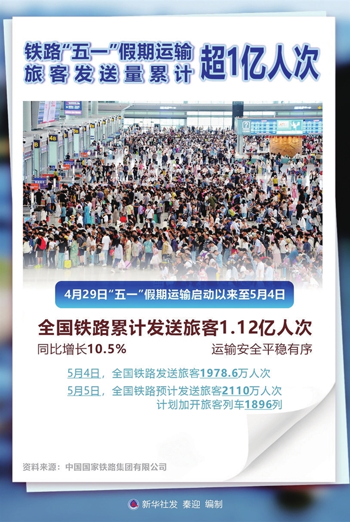据中国国家铁路集团有限公司消息,4月29日“五一”假期运输启动以来至5月4日,全国铁路累计发送旅客1.12亿人次,同比增长10.5%,运输安全平稳有序。
