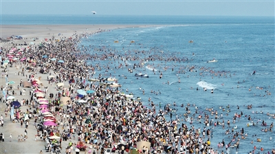 5月4日,游客在广西北海银滩国家旅游度假区戏水(无人机照片)。