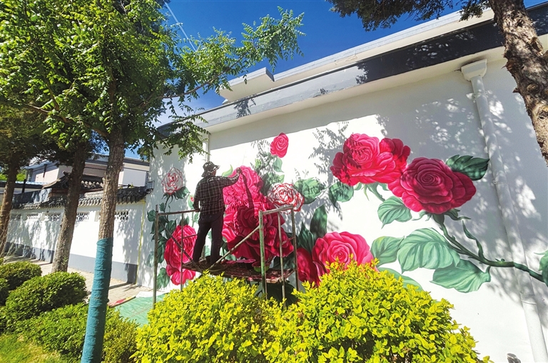 五月六日,万柏林区九院新村,工作人员正在绘制墙绘。一幅幅精致的墙绘与整洁的环境完美交融,构成一幅和美乡村图景。邓寅明 摄