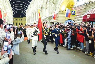 5月3日,在俄罗斯首都莫斯科,中国人民解放军仪仗司礼大队参加苏联伟大卫国战争胜利80周年阅兵式彩排。新华社记者 姚大伟 摄