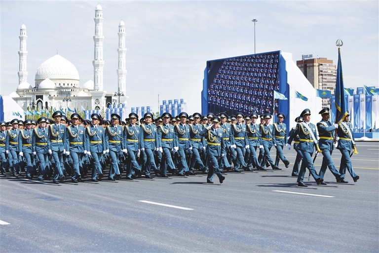 据哈通社报道,当天共有4000多名哈官兵、200多件武器装备及66架军用飞机亮相阅兵式,其中有无人机和反导系统等最新军事装备。哈总统托卡耶夫、正在对哈进行国事访问的越共中央总书记苏林、哈政府及外交使团代表以及二战老兵等共计5000余人现场观礼。