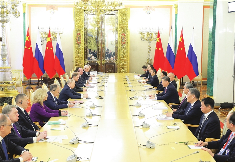 习近平指出,中俄双方要坚持合作大方向,排除外部干扰,让合作“稳”的基础更坚实、“进”的动能更充足。要发挥两国资源禀赋和产业体系互补优势,拓展经贸、能源、农业、航空航天、人工智能等领域高质量互利合作;以共建“一带一路”和欧亚经济联盟对接为平台,构建高标准互联互通格局;充分释放“中俄文化年”潜能,加强教育、电影、旅游、体育、地方等合作,促进深层次民心相通;密切在联合国、上海合作组织、金砖国家等多边平台协调和配合,团结全球南方,坚持真正的多边主义,引领全球治理变革正确方向。
