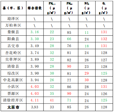 1.综合指数、PM10和NO2指标排名前两位的标为绿色,排名后两位的标为红色;