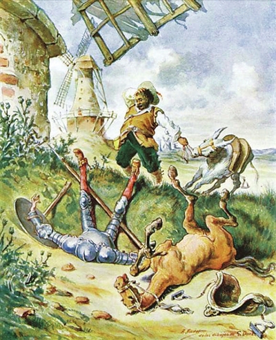 读者们或多或少都对堂吉诃德大战风车的故事耳熟能详。这样的笑闹剧情在这部著作中不只是灵光一现的插科打诨。我在阅读这一章节时,内心却是复杂的况味:堂吉诃德把那几十架风车看作是“无法无天的巨人”,决心要为上帝清除掉他们,打一场“正义之战”。这在正常的思路看来,是疯狂的精神状态,是一种负隅顽抗的偏执。而我认为,堂吉诃德的这一行为,浸透着悲凉的人生底色。他之所以会有这样令人感到荒唐和匪夷所思的行为,或许和他常年沉浸在骑士小说中有关。他不自觉地将骑士精神中的勇敢、忠诚、大无畏的性格辉光,投射到具体的现实境遇中。堂吉诃德试图凭借一己之力改天换地,对抗荒诞,却让自己身陷这种困窘和无人理解的境地。而一路与堂吉诃德作对的桑丘·潘沙,在堂吉诃德临终前悔悟并焚毁骑士小说时,桑丘却开始模仿主人堂吉诃德的语言,完成了一场人生之旅的殊途同归和精神衣钵的隐秘传递。