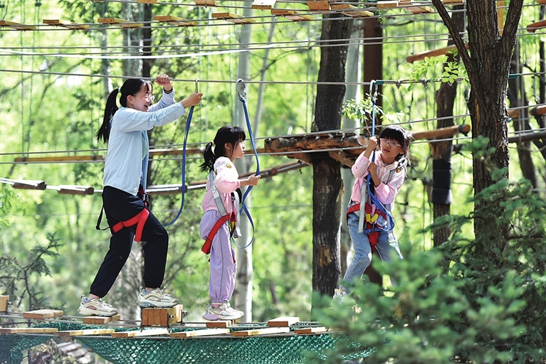 5月18日,太原森林公园内,孩子们正在进行拓展训练。在“双减”政策背景下,孩子们利用周末时间进行拓展训练,通过一系列富有挑战性的活动,增强自信心和独立性。邓寅明 摄