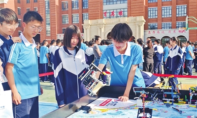 自2019年起,育英中学每年一度的科技节活动已成为该校课程建设中的一大亮点和特色,为学生成果展示搭建了平台,通过融合探究性学习、跨学科协作与动手实践,提高了学生科学探究素养。该校的机器人社团在连续五年的省市级大赛中摘金夺银,今年,该校成功申报了“全国中小学科学教育实验校”。(张晓丽 文/摄)