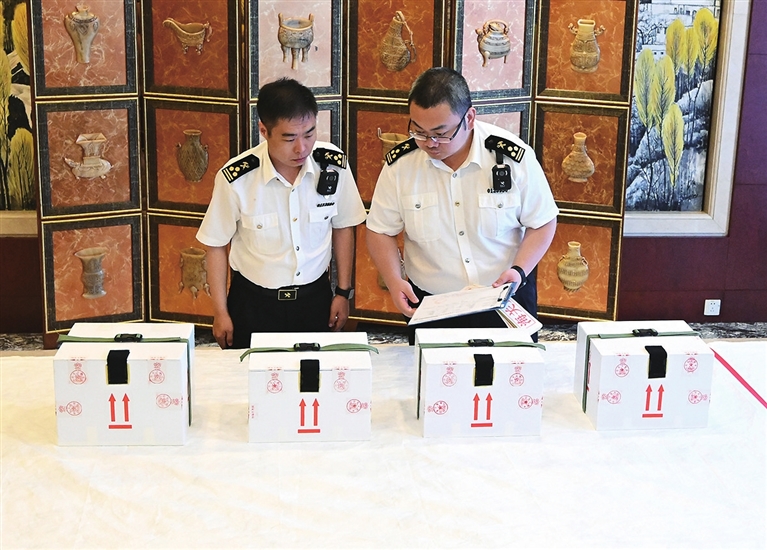 5时06分,文物抵达要客区,安放在铺有软垫的桌子上。海关人员查验完报关单后,工作人员小心翼翼开启了装有月名图的包装箱封条。