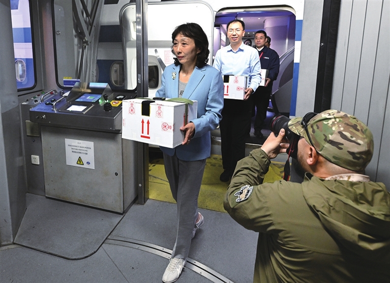 4时45分,准备妥当后,4名工作人员每人手捧一件文物包装箱,缓步离开机舱。文化和旅游部副部长、国家文物局局长饶权迎候在廊桥口,等待接收。