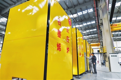 5月19日,太原赛因新材料科技有限公司内,工作人员正在调试焦耳石墨烯反应炉。该公司主要致力于石墨烯和高端碳材料的生产,通过自主研发的闪速焦耳热工艺技术,能够将炭黑、无烟煤等碳素原料在短时间内转化为高价值的石墨烯等产品,该技术具有低成本、无污染等特点,已获多项专利认证。郭苑甫 摄
