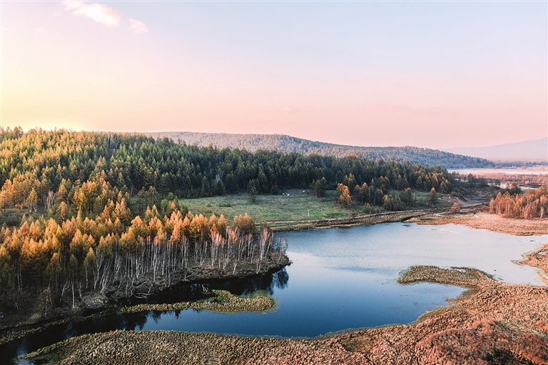 这是5月19日在内蒙古阿尔山国家森林公园拍摄的夕阳下的湖泊风光(无人机照片)。