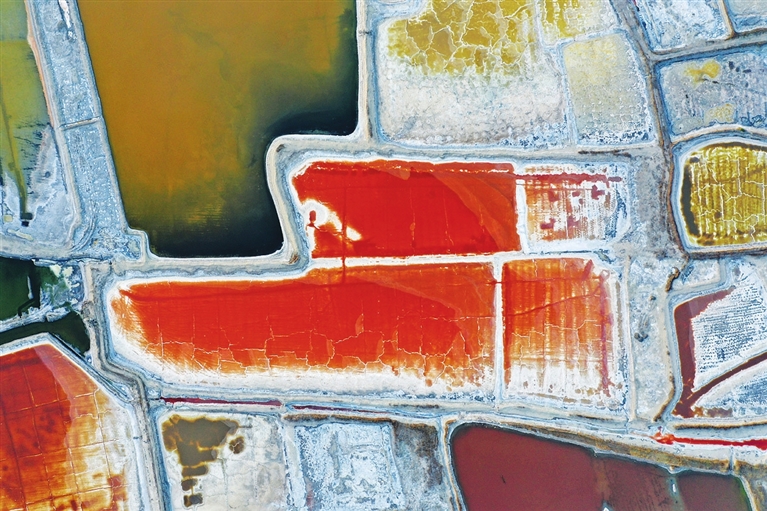 连日来,随着气温持续升高,位于山西南部的运城盐湖呈现出色彩斑斓的景象,从空中俯瞰,如同一块块散落在大地上的调色盘。新华社记者 詹 彦 摄