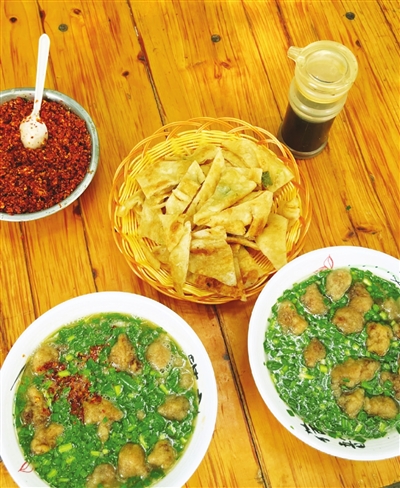 烙饼的制作过程像是一场艺术表演。师傅将醒好的面团擀成薄如宣纸的面片,抹上胡麻油,撒上椒盐和葱花,熟练地折叠、卷起,再擀成圆圆的面饼。铁鏊上腾起阵阵香气,面饼在师傅的竹片下灵活翻转,不一会儿就变得金黄酥脆。最绝的是那一手“抖饼”的绝活,师傅轻轻一拎,饼就如金缕般丝丝散开,外层酥脆,内里柔软,麦香混着油香,让人忍不住咽口水。