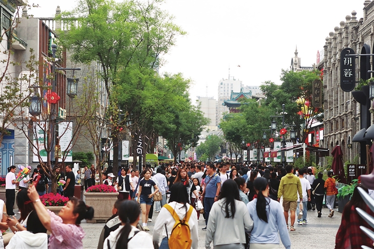 上图为5月31日,钟楼街上游客熙熙攘攘。张澍宏 摄