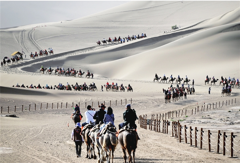 6月2日,游客在甘肃省敦煌市鸣沙山月牙泉景区游览。 新华社发 (张晓亮 摄)