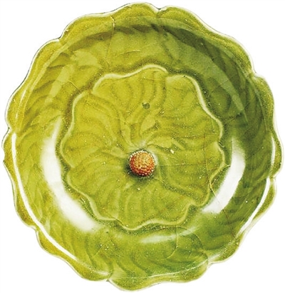 这件瓷盘采用六瓣葵花口设计,弧腹平底,矮圈足无釉,通体施青黄色釉,釉面开大纹片。盘内腹与底部的刻划纹饰尤为精妙,水波状纹如叶脉般由边缘向中心汇聚,最终化为枝叶纹。中央的荔枝为露胎贴塑工艺制成。