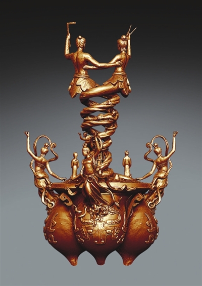 走进博览会现场,张国梁的《人祖鬲》铸铜熏炉静静陈列在展台上,却仿佛有着无形的吸引力,引得观众纷纷驻足。一位年轻观众忍不住惊叹:“快看,这件作品把神话故事都‘铸活’了!”的确,这件作品浑身上下都散发着神秘而迷人的气息。青铜特有的古朴光泽,历经岁月般沉静内敛,与灵动飘逸的飞天纹饰相得益彰,一静一动间,碰撞出独特的艺术美感。