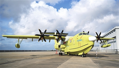 6月11日,在珠海中航通飞华南飞机工业有限公司,现场展示的批量生产的首架AG600飞机。当日,我国完全自主研制的大型水陆两栖飞机AG600“鲲龙”在广东珠海获颁中国民航局生产许可证,标志着AG600飞机正式迈入批量生产阶段。新华社记者 邓 华 摄