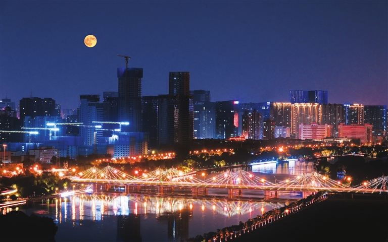 6月11日晚9时许,本年度“最低满月”现身并州上空。在太原南内环桥畔,一轮又大又圆的满月与城市灯光交相辉映,美不胜收。耿婧媛 摄
