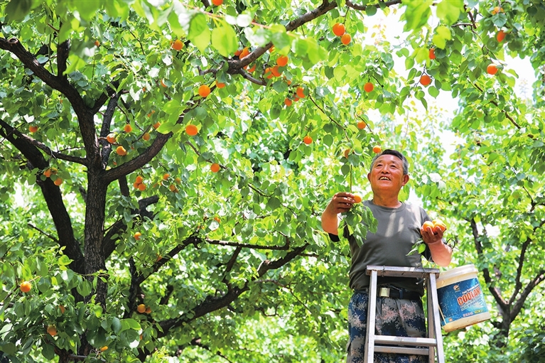 6月15日,晋源区姚村镇黄楼村凯特杏进入成熟期,金黄的果实映衬着村民的喜悦,构成一幅美丽的丰收画卷。近年来,该村依托农业特色资源优势,引导农户因地制宜种植特色农产品,助力乡村振兴。王韵菲 摄