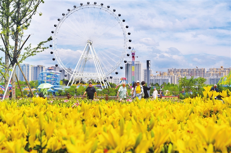 六月十六日,正在举办的晋阳湖百合花展上,十二万株“云裳仙子”迎风绽放,绚丽夺目,吸引了众多游客。牛利敏 摄