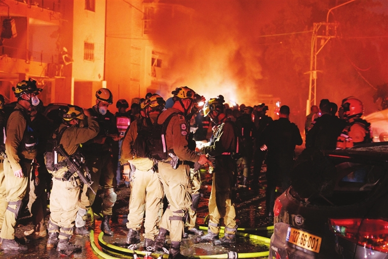 6月15日,在以色列北部城市海法,应急救援人员在导弹袭击现场工作。