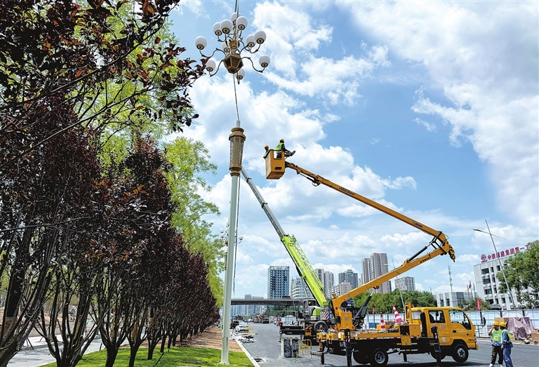 6月17日,迎泽大街(西段)改造工程现场,施工人员对路灯进行了安装调试,全力保障工程有序推进。牛利敏 摄