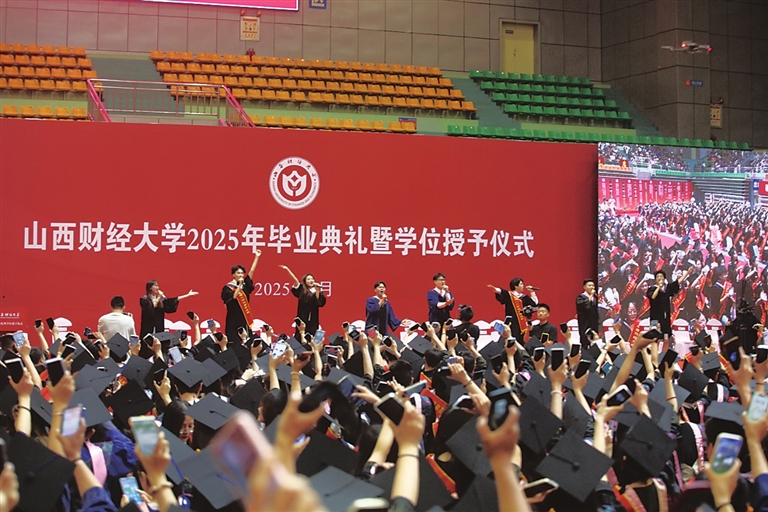 进入六月,高校迎来毕业季。图为六月十八日,山西财经大学二O二五年毕业典礼上,学生们一起演唱歌曲。张澍宏 摄