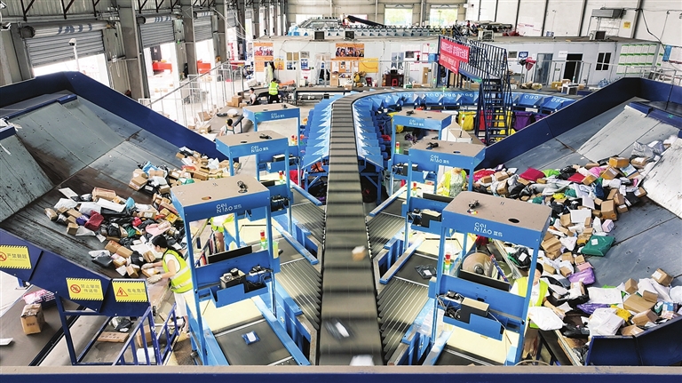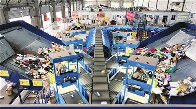 6月18日,在重庆市秀山土家族苗族自治县武陵现代物流园区快递分拨中心,工作人员在智能快递分拣流水线上作业(无人机照片)。时值电商平台“618”年中促销活动高峰,各地电商、物流等线上线下企业、商家全力应对。新华社发