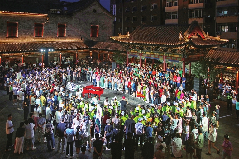 夜幕降临,在钟楼街与柳巷交叉路口,一场融合青年职工风采与劳模精神的快闪合唱首先亮相。6名年轻职工组成的合唱团以激昂的《年轻的朋友来相会》点燃全场,青春的旋律扑面而来,轻快流畅的旋律和朗朗上口的歌词,传递出积极向上的奋斗精神,鼓励年轻人投身时代建设,洋溢着对理想、友谊和未来的美好向往。