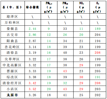 1.综合指数、PM10和NO2指标排名前两位的标为绿色,排名后两位的标为红色;