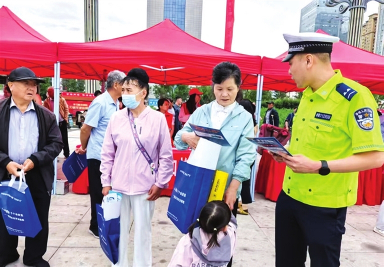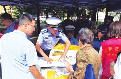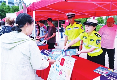 活动现场,民警通过设置交通安全咨询台、发放宣传手册等方式进行宣传,吸引众多群众驻足观看。民警结合交通安全实际,以“一盔一带”“两客一危一货一面”“电动自行车、摩托车安全出行”等主题,结合夏季道路交通特点,面对面向群众普及、讲解道路交通安全知识、教育引导广大群众树牢交通安全意识,规范自身交通行为,积极参与和支持道路交通事故预防工作。同时,民警还热心解答群众的提问,向群众分析讲解日常道路交通出行中容易忽视的交通安全细节问题和常见的交通陋习,解答群众办理车驾管、违章处理、事故处理等业务遇到的问题。