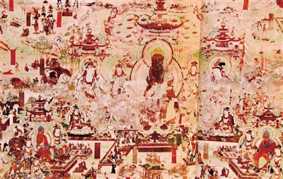 秦汉时期,最早舶来的合成颜料——铅白和铅丹即通过西域进入中原。另外,在秦始皇彩绘兵马俑中检测到神秘的“汉紫”颜料,化学式为硅酸铜钡,这是我国发现的最早的合成颜料,其合成源于先秦时期的琉璃工艺,因此又被称作“中国紫”。在汉代的墓葬壁画及出土文物中,对于朱砂和铁红的使用已经非常普遍,锰铁矿也是较早用于彩陶、漆器上的矿物质原料。此时的古人已经掌握了草石并用的绘画技法,即用植物染料染底色,再用彩色矿物颜料描绘图案,最后用白颜料勾勒衬托。在长沙马王堆西汉墓出土的T形帛画中,利用现代科技检测到有30多种颜料,还检测出栀子、靛蓝、茜素等多种植物染料。