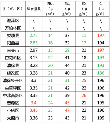 1.综合指数、PM10、NO2和O3指标排名前两位的标为绿色,排名后两位的标为红色;