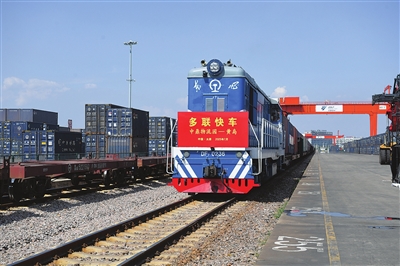 7月1日,“中鼎物流园—黄岛”X9538次图定多式联运班列首发。该列车运送的50个集装箱光伏组件在抵达青岛港黄岛站后,将装船运往阿曼苏丹国塞拉莱港。当日,国铁太原局每周增开中鼎物流园至天津、青岛、广州3个方向6趟图定多式联运班列。牛利敏 摄