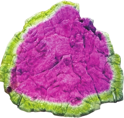 西瓜碧玺晶体中心呈现粉红色,边缘包裹着翠绿色,酷似切开的西瓜,因而得名。