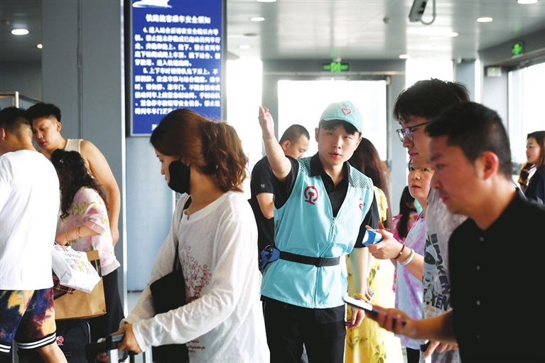 暑运期间,志愿服务成为车站一道亮丽的风景线。7月5日,来自山西大学的20余名志愿者在太原南站为旅客提供问询答疑、宣传引导、重点帮扶等服务。牛利敏 摄