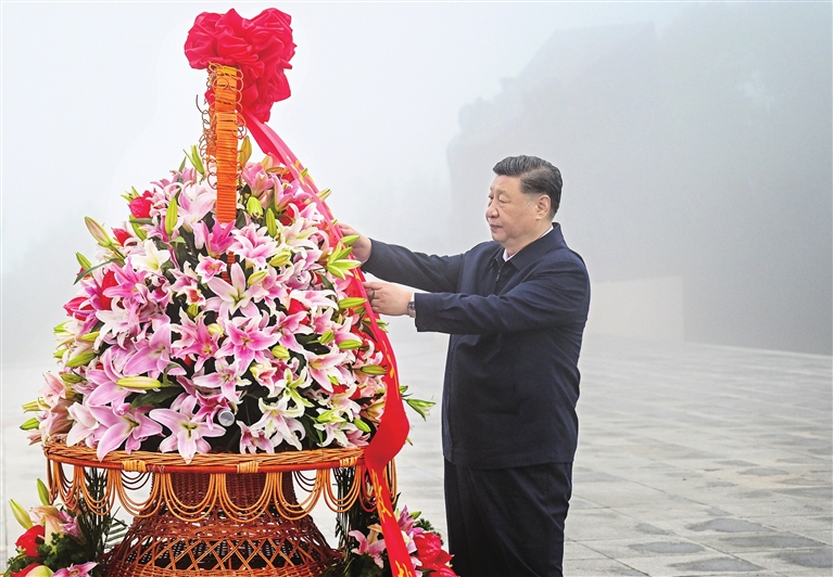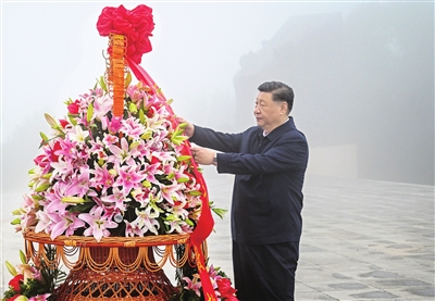 7月7日至8日,中共中央总书记、国家主席、中央军委主席习近平在山西考察。这是7日下午,习近平在位于阳泉市狮脑山的百团大战纪念碑广场,向八路军烈士敬献花篮。新华社记者 燕 雁 摄