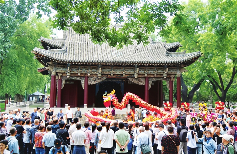 7月9日,农历六月十五,晋祠博物馆举行“难老河会”大型民俗活动。锣鼓喧天,龙飞狮舞,游人近距离感受民俗文化的魅力。郭苑甫 摄