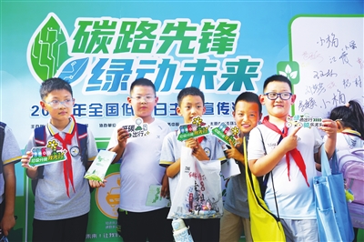 恰逢学校放学,宣传活动也受到孩子们的热情参与,他们一笔一画签下自己的姓名,低碳环保的种子也在他们心中悄悄萌发。